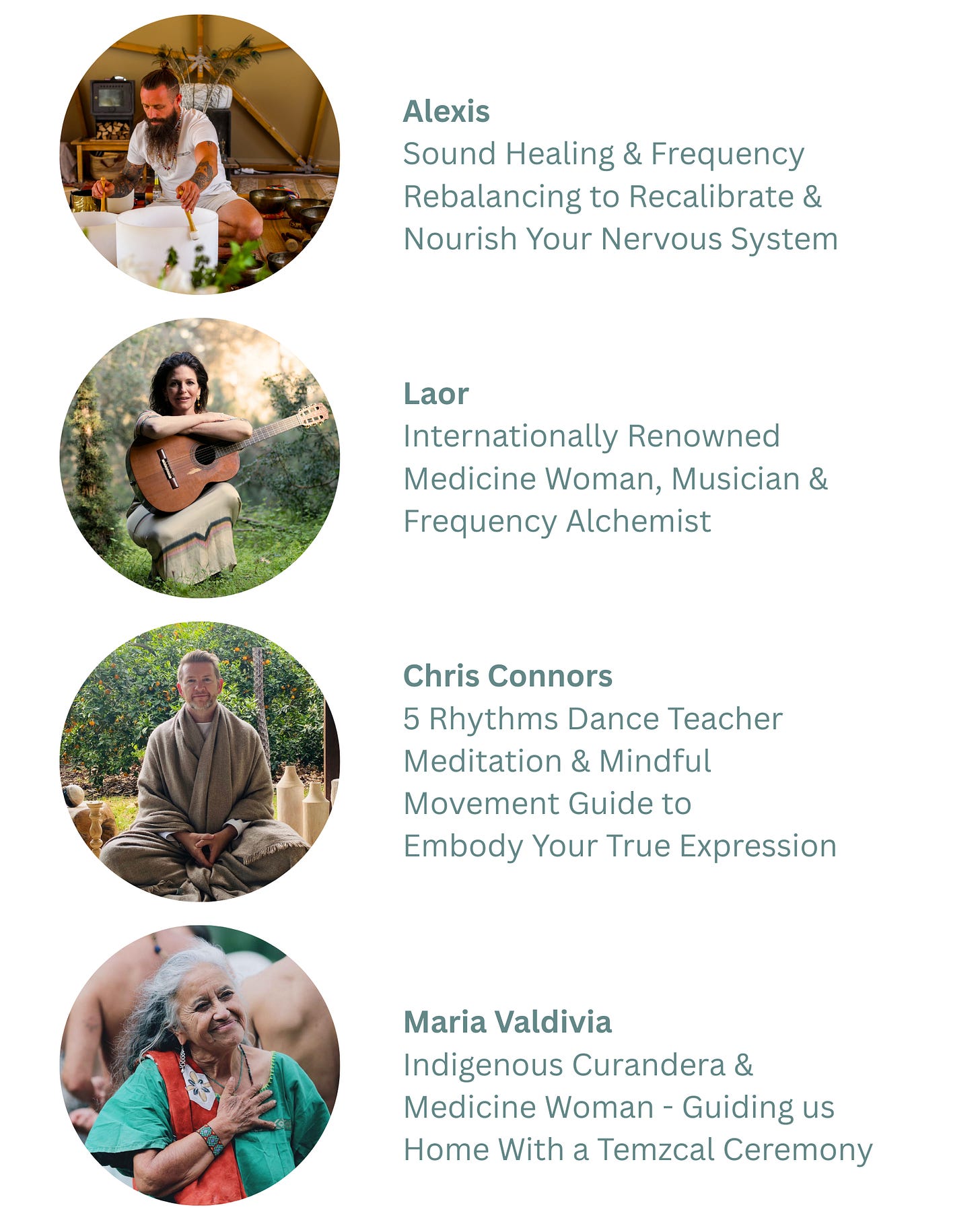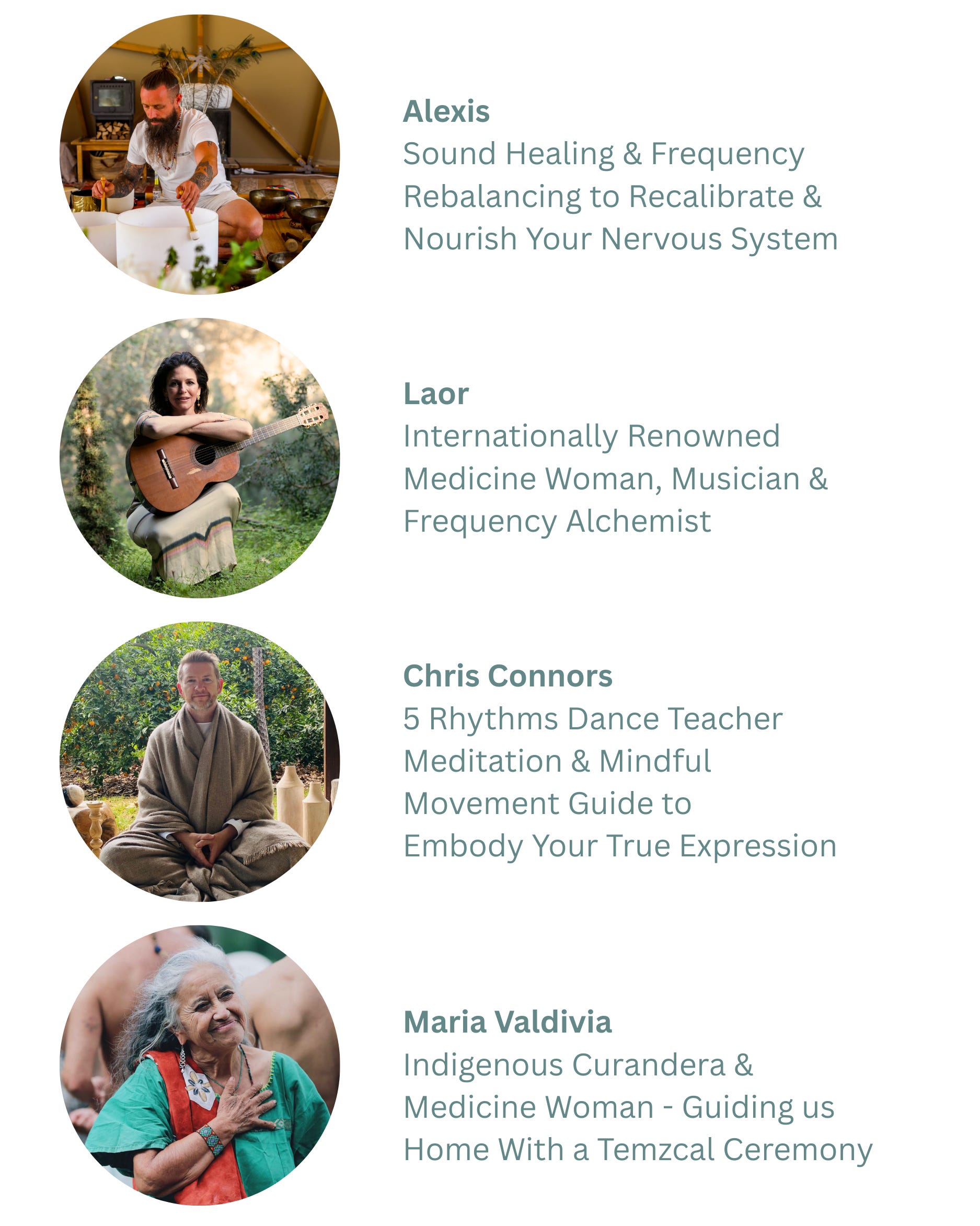 (sound baths, cacao fire ceremony with Vocal Activation, transformational breath-work, enhanced hike in Mother Nature, Temazcal (sweat-lodge)